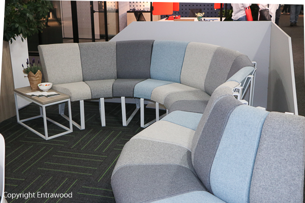 The design incorporated elements from both the Elevate storage range (frame), and the Salon soft seating range combined with considered proportions and materials to make this range part of the greater Entrawood/Entrakor corporate product family. The result is both comfortable, effective (acoustic dampening) and practical (plug-and-play) and you could work undisturbed and uninterrupted for 2-3 hours. Many expo visitors also came to have their picture taken in our blush pink and Grey Cocoon Pod – #CocoonPod 😉
