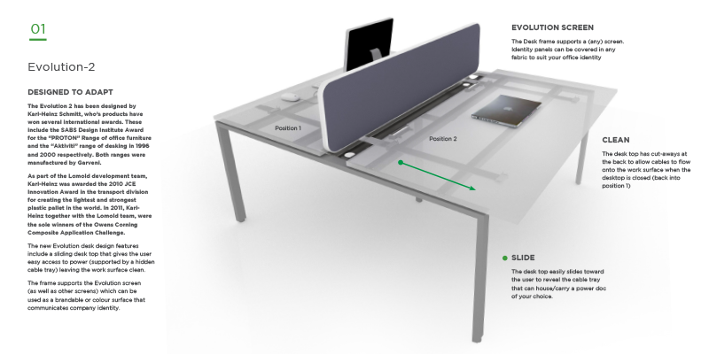 We also look to the future and gave our clients a glimpse of what’s to come in the Evolution 2 range. With smooth sliding-top desks, there will be no need for expensive power docs mounted on the desk top, and no need to ever climb under your desk again. The cable tray carries a power plug/doc that is easily accessed or hidden by the sliding top.