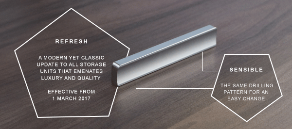 The new storage handle is a modern yet classic upgrade to all our storage products. Clean lines, subtle presence, good quality and considered proportions are a few of the reasons we love this new handle. We will implement the change from 1 March 2017, here are a few practical points explained to ensure a smooth transitions: