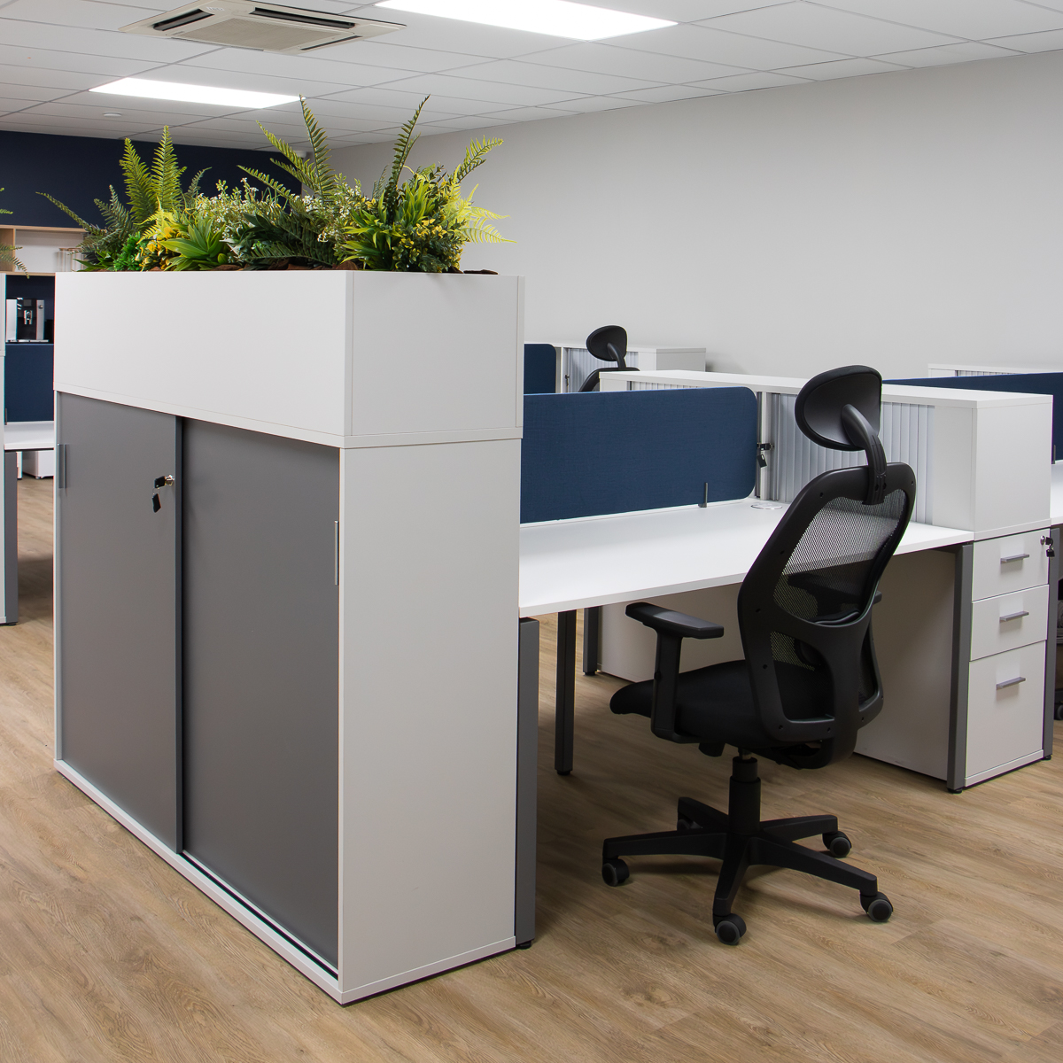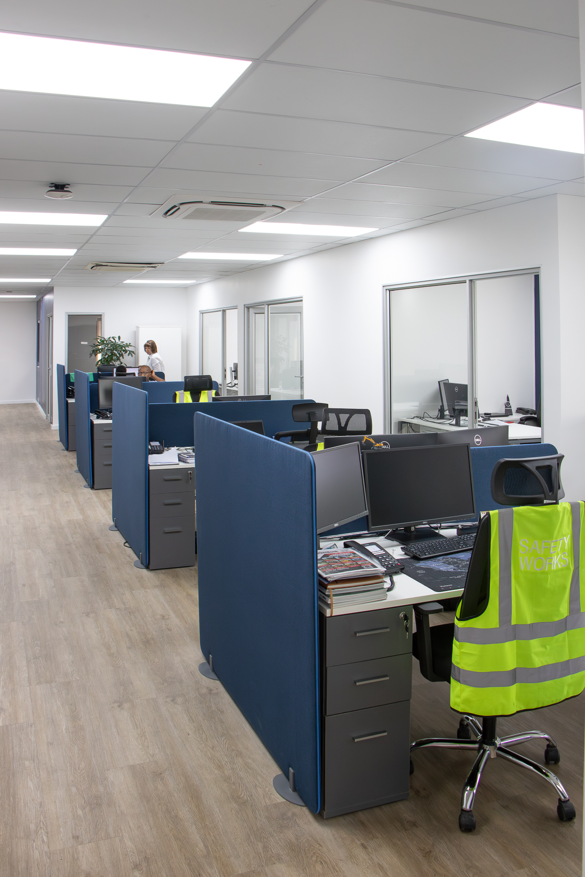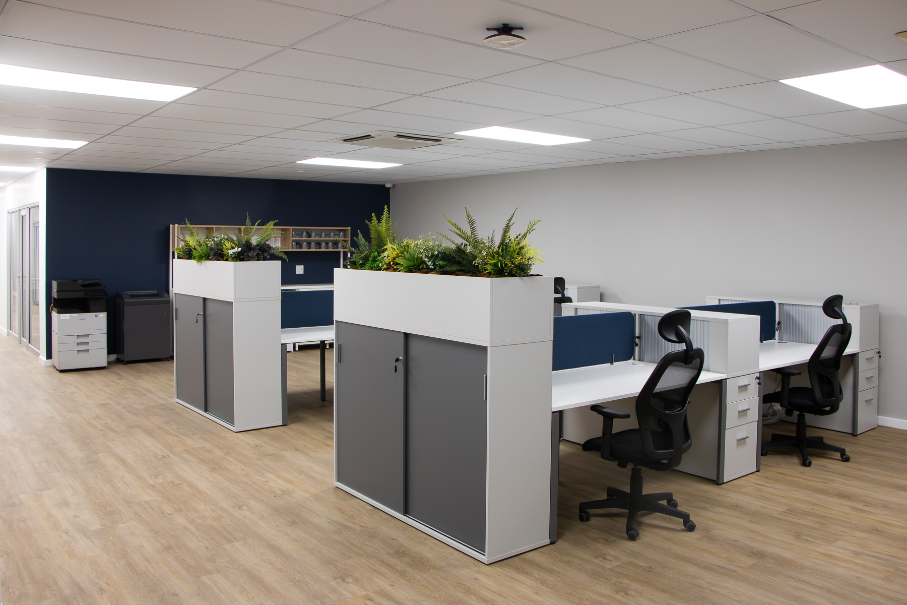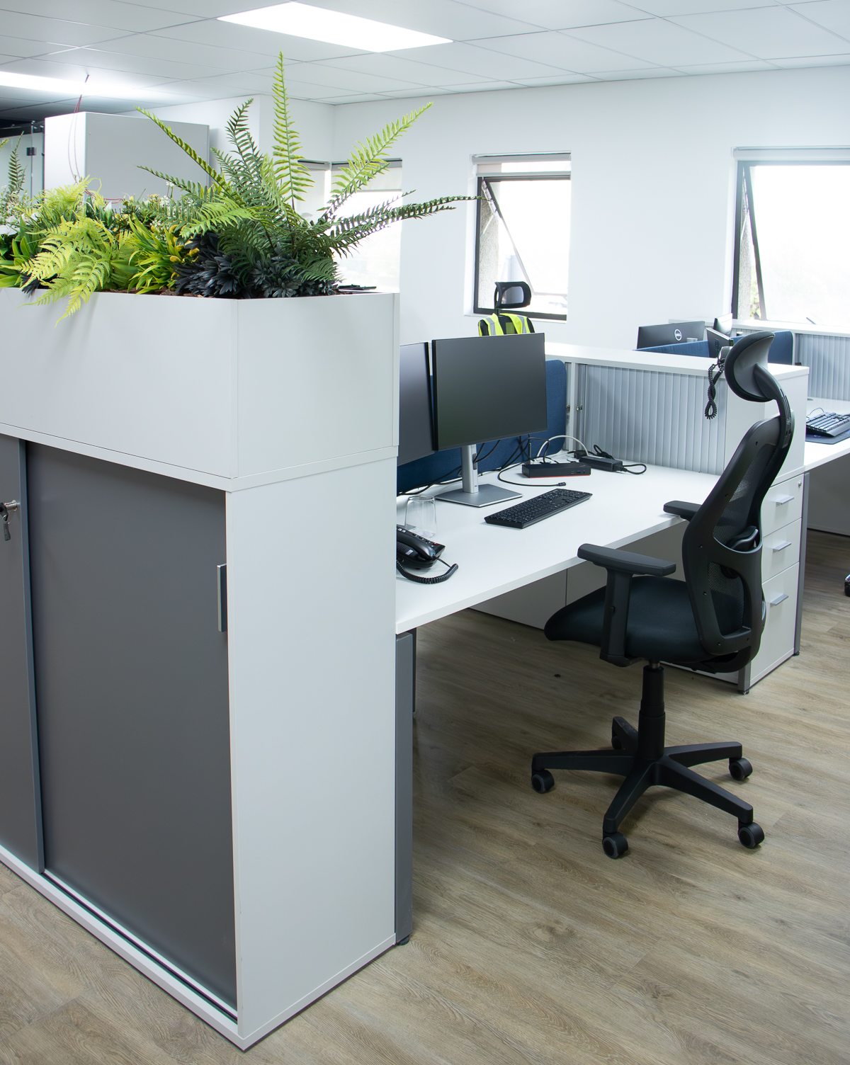 The office has various open-plan spaces, coffee and printing stations, meeting rooms, a boardroom, private offices and executive offices. By carefully combining different finishes, lighting and colours the office looks both professional and friendly. With practical storage solutions, desktop power strategically placed screens, planters and soundproof task pods (that can be viewed in the Entrawood showroom) the usability of the office is maximised.