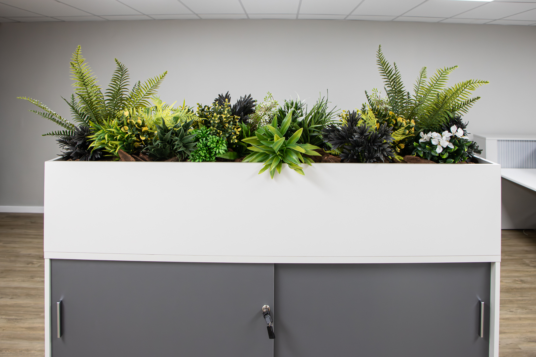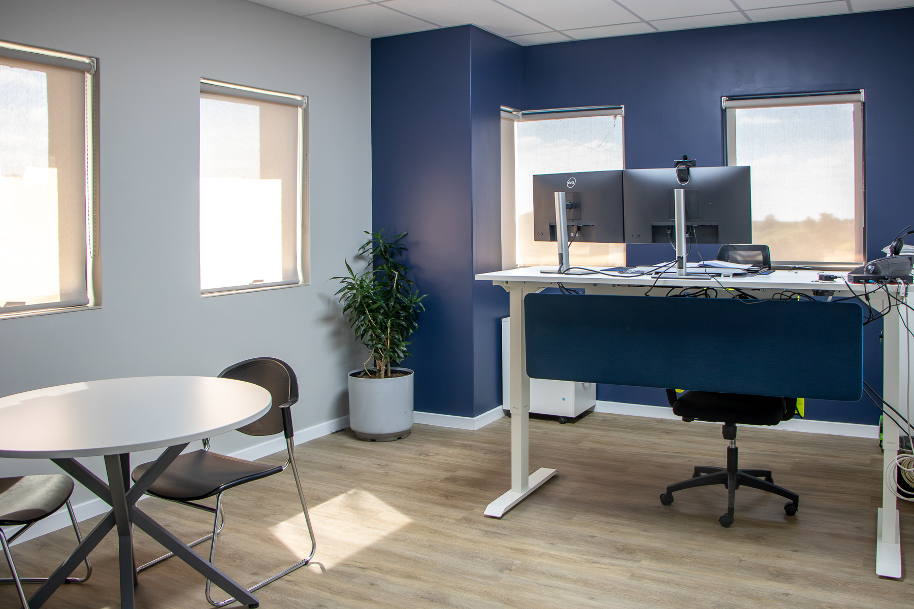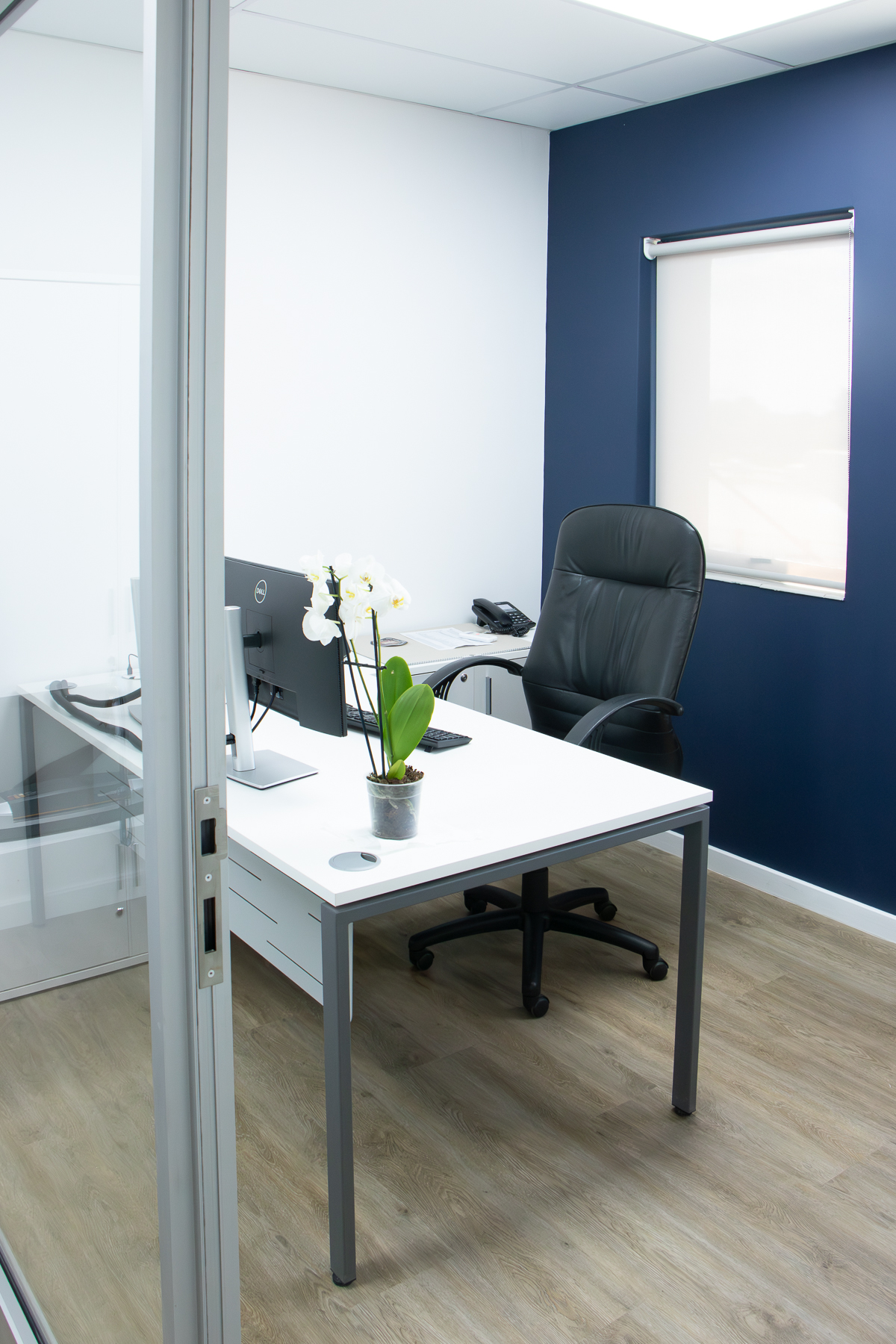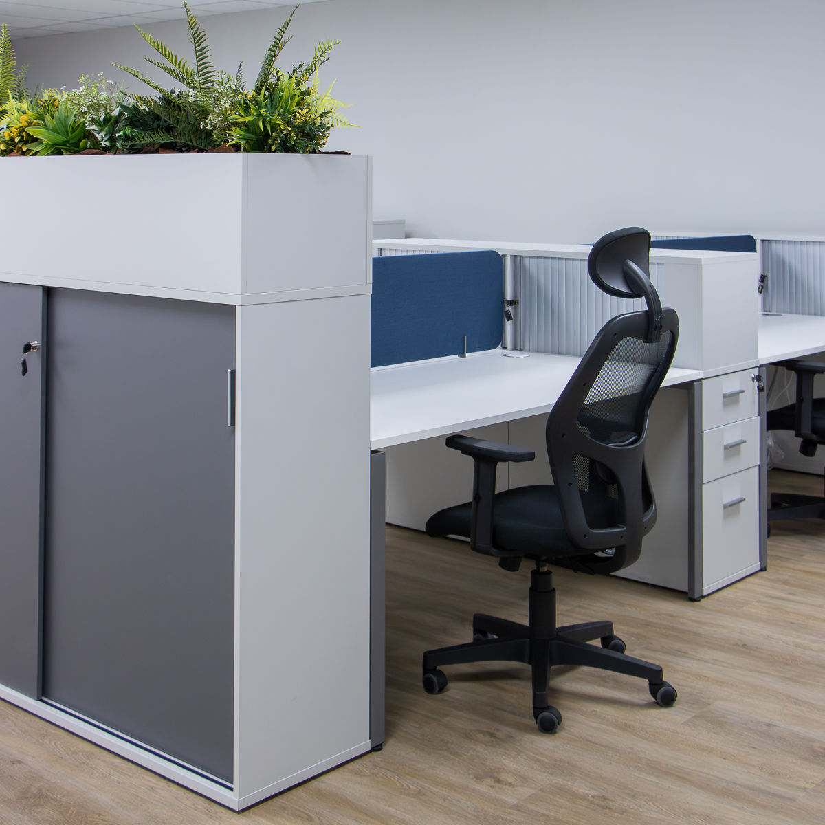 The office has various open-plan spaces, coffee and printing stations, meeting rooms, a boardroom, private offices and executive offices. By carefully combining different finishes, lighting and colours the office looks both professional and friendly. With practical storage solutions, desktop power strategically placed screens, planters and soundproof task pods (that can be viewed in the Entrawood showroom) the usability of the office is maximised.