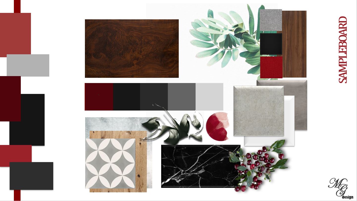 Micaela’s concept of powerful yet sophisticated was best captured in her Concrete and glass reception unit. Bringing in warmth with natural wood grains and red as an accent.