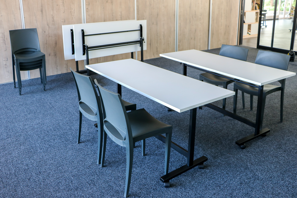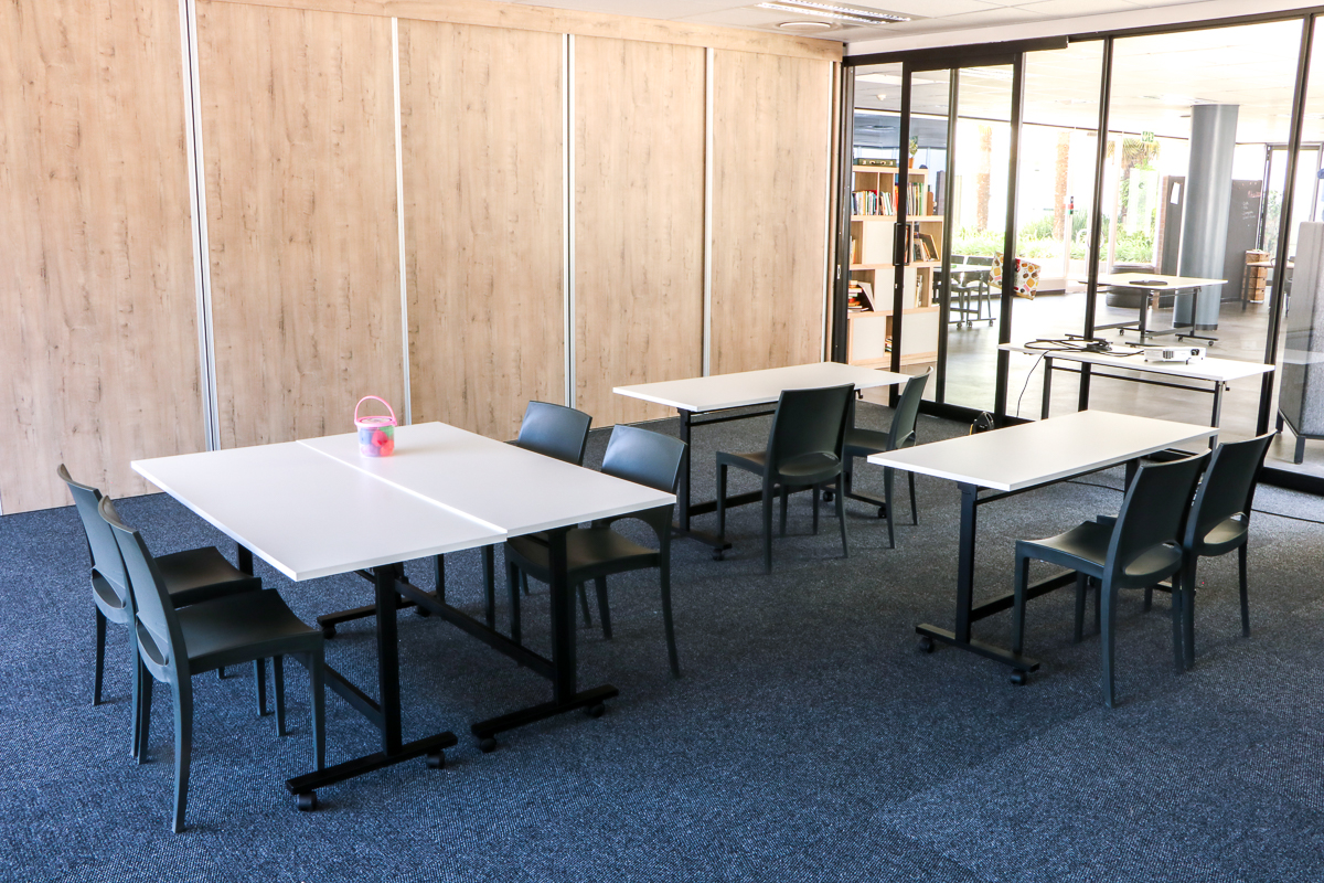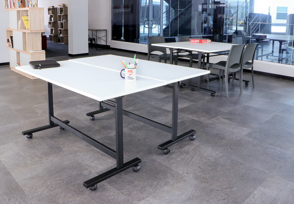 Mitra Academy worked closely with Align studio to create a space where the furniture could easily be moved around so that each configurations would cater to a different activity or learning experience. The classroom must transform into a dance studio or a presentation room effortlessly. The desks in the space are all mobile fold-and-nest tables that seat 2, the seating is lightweight and stackable. There are also workstations for group work around a TV monitor (coming later) paired with 4 mobile ottomans. The Cocoon Pods are great for private work or a reading nook.that the available space will serve the business for the next 3-4 years.