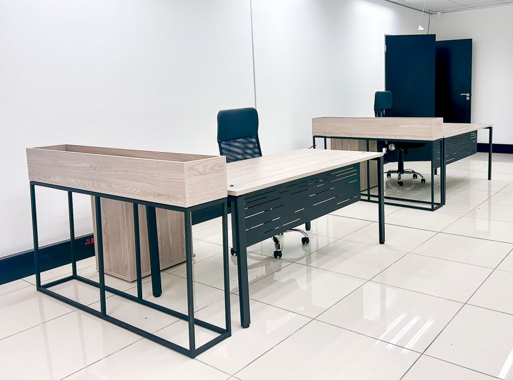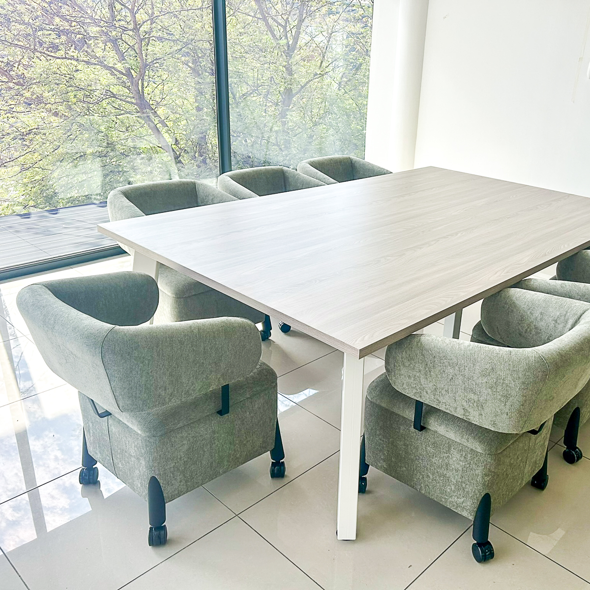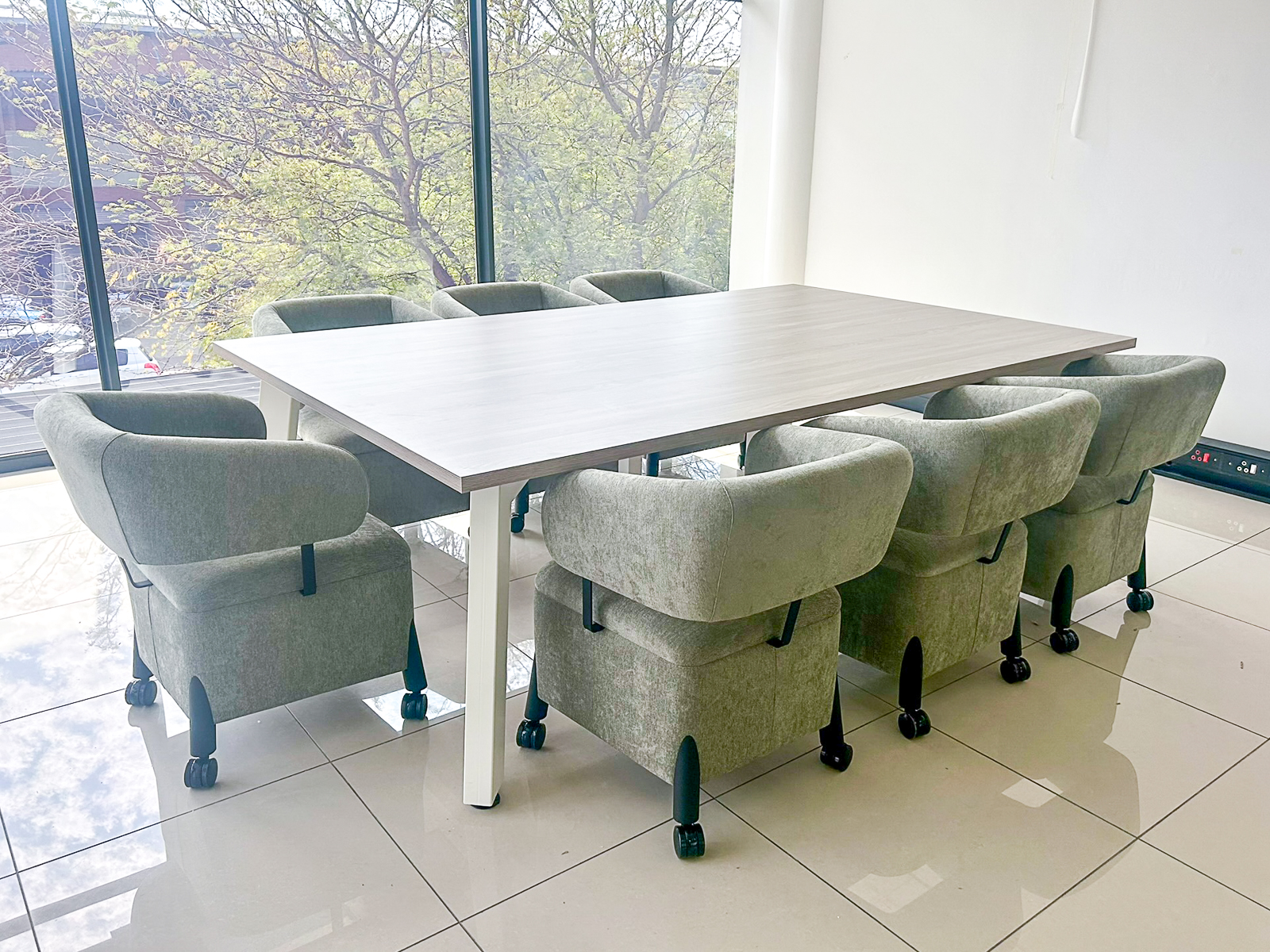 The client wanted a light & calm office space that exudes quiet sophistication. To get the look, we used a combination of the Evolution range in the open plan with planters. The lounges consist of Envy 2 seater, salon chairs and coffee tables. Private offices have opera desks and an opera server, while the meeting room combines a custom-sized Tribe table with Rocket chairs and a fantastic view!
