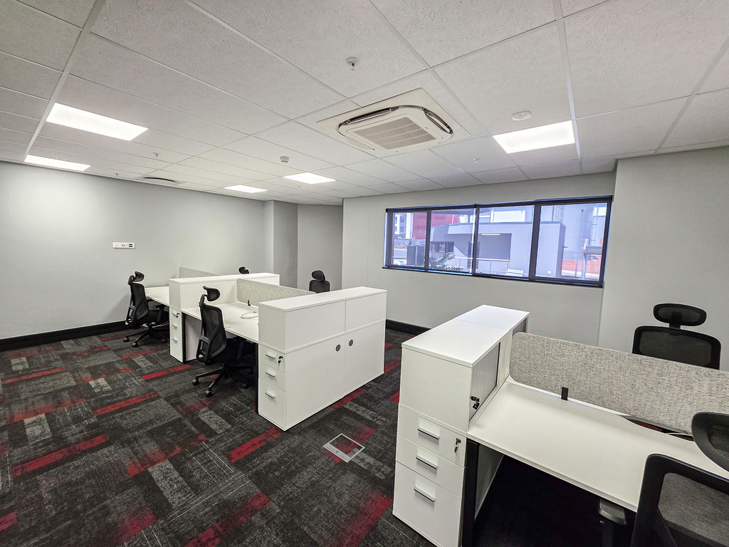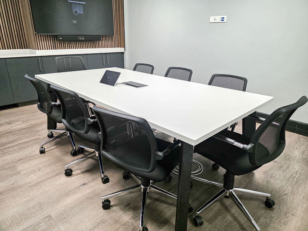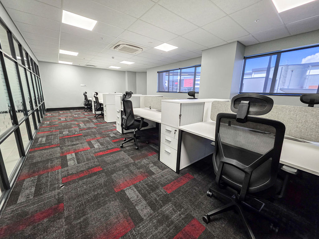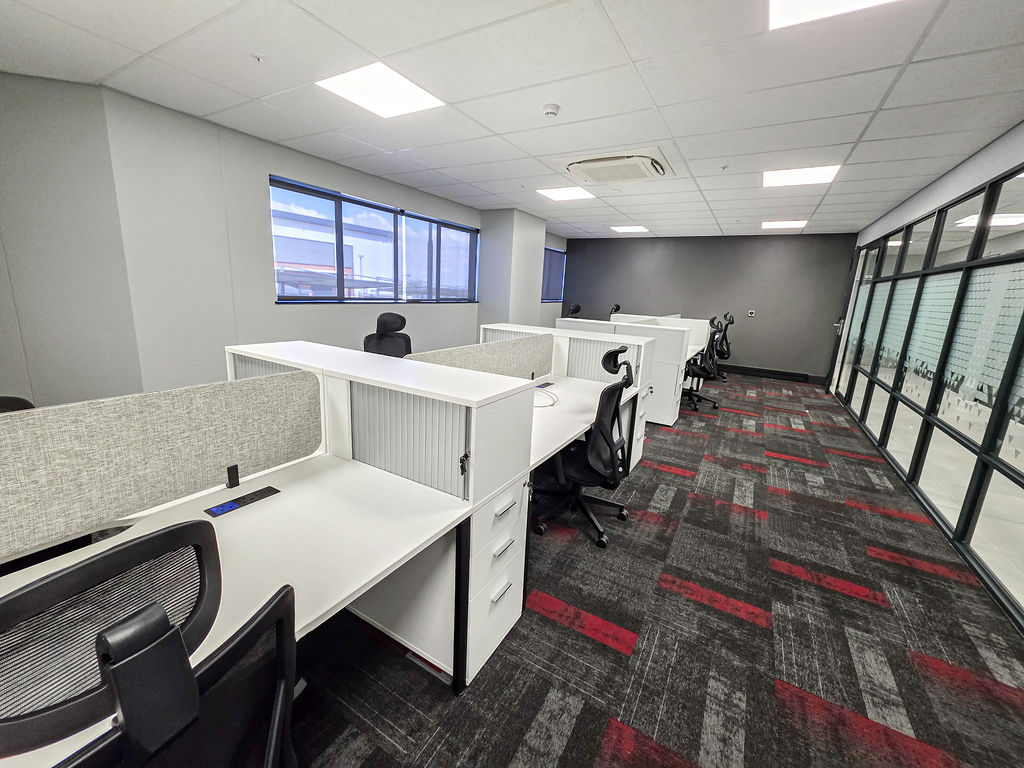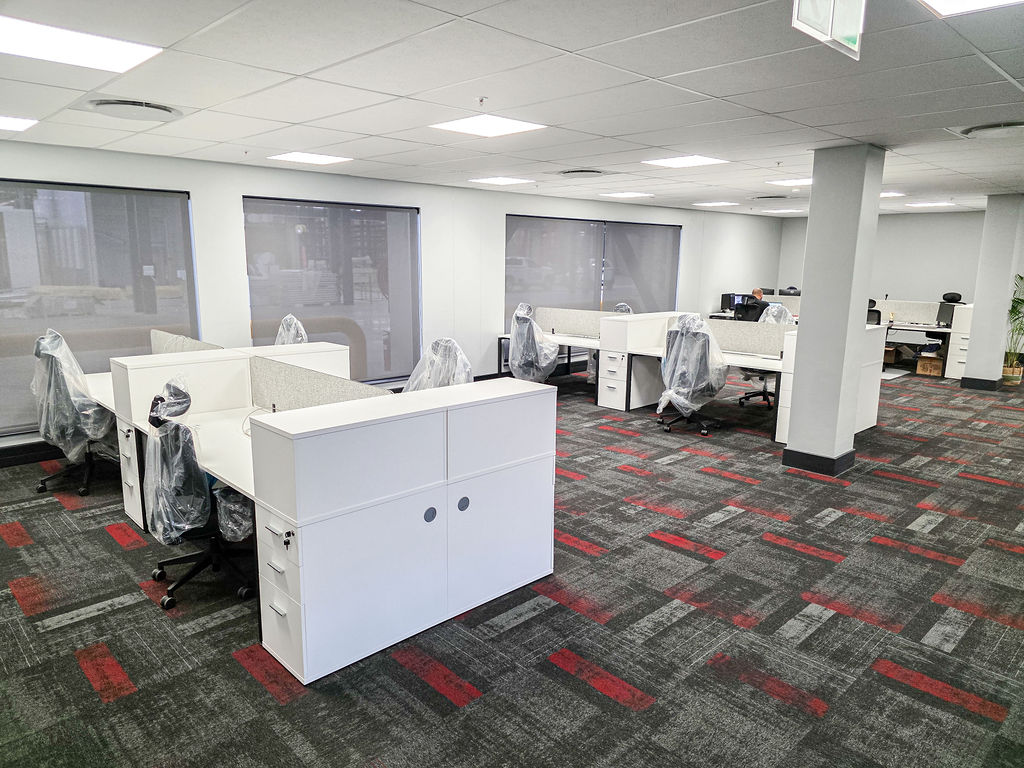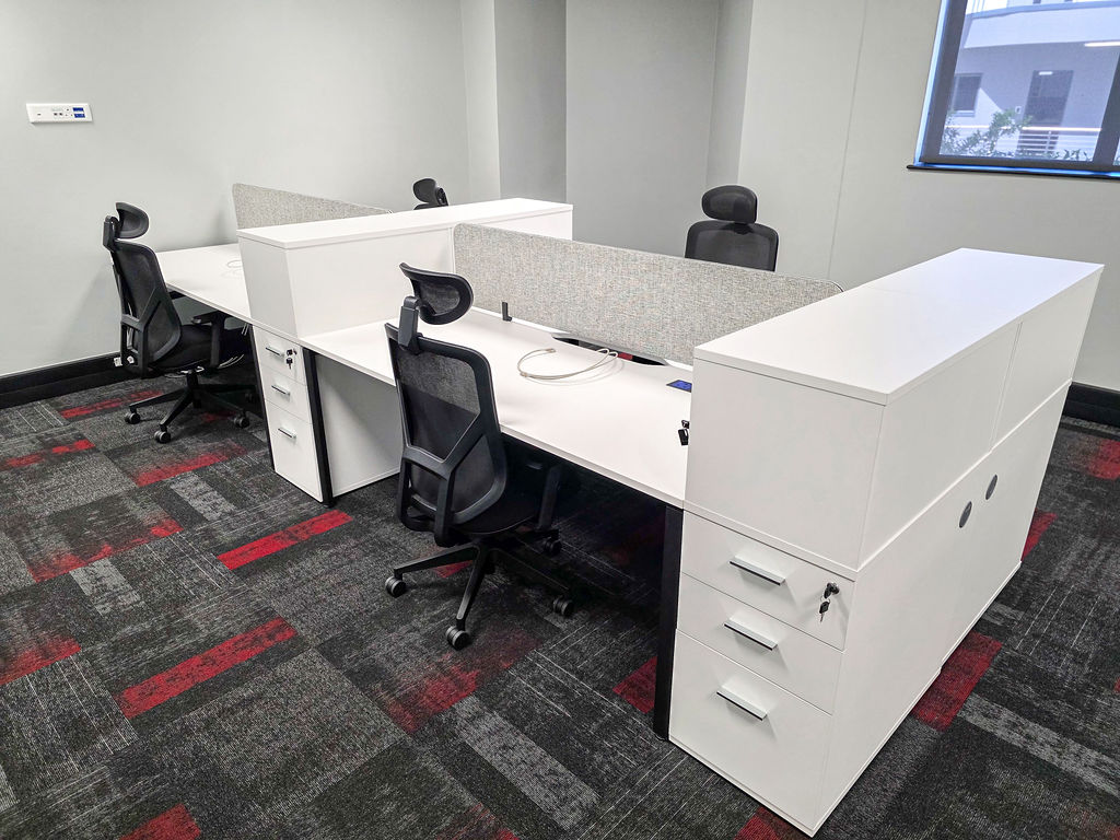 Office furniture installation, using bench desking in the open plan area, with multi-storage for both work-related files, tools and personal items, keeping the open-plan neat and structured. The desktops incorporate power-sets for ease of connecting as well as a cut-away in the centre for additional power reticulation. Cocoon Screens offer additional acoustic absorption to the space.