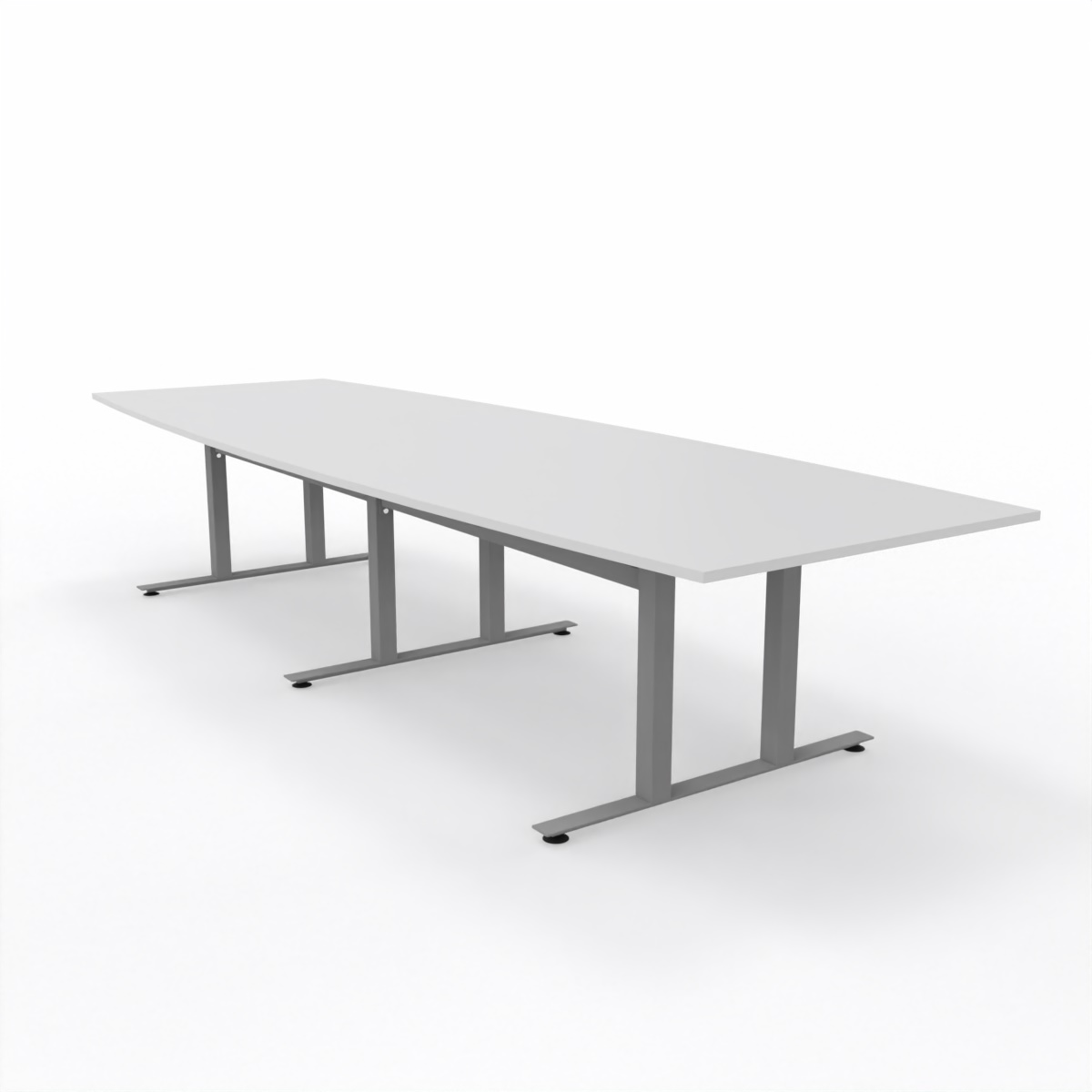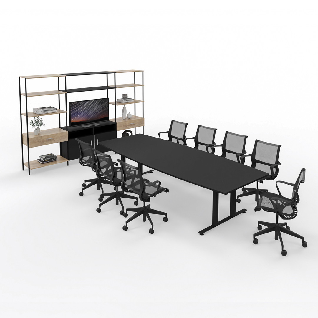 Featured here is the Echo boardroom table with a barrel-shaped top and steel frame.
